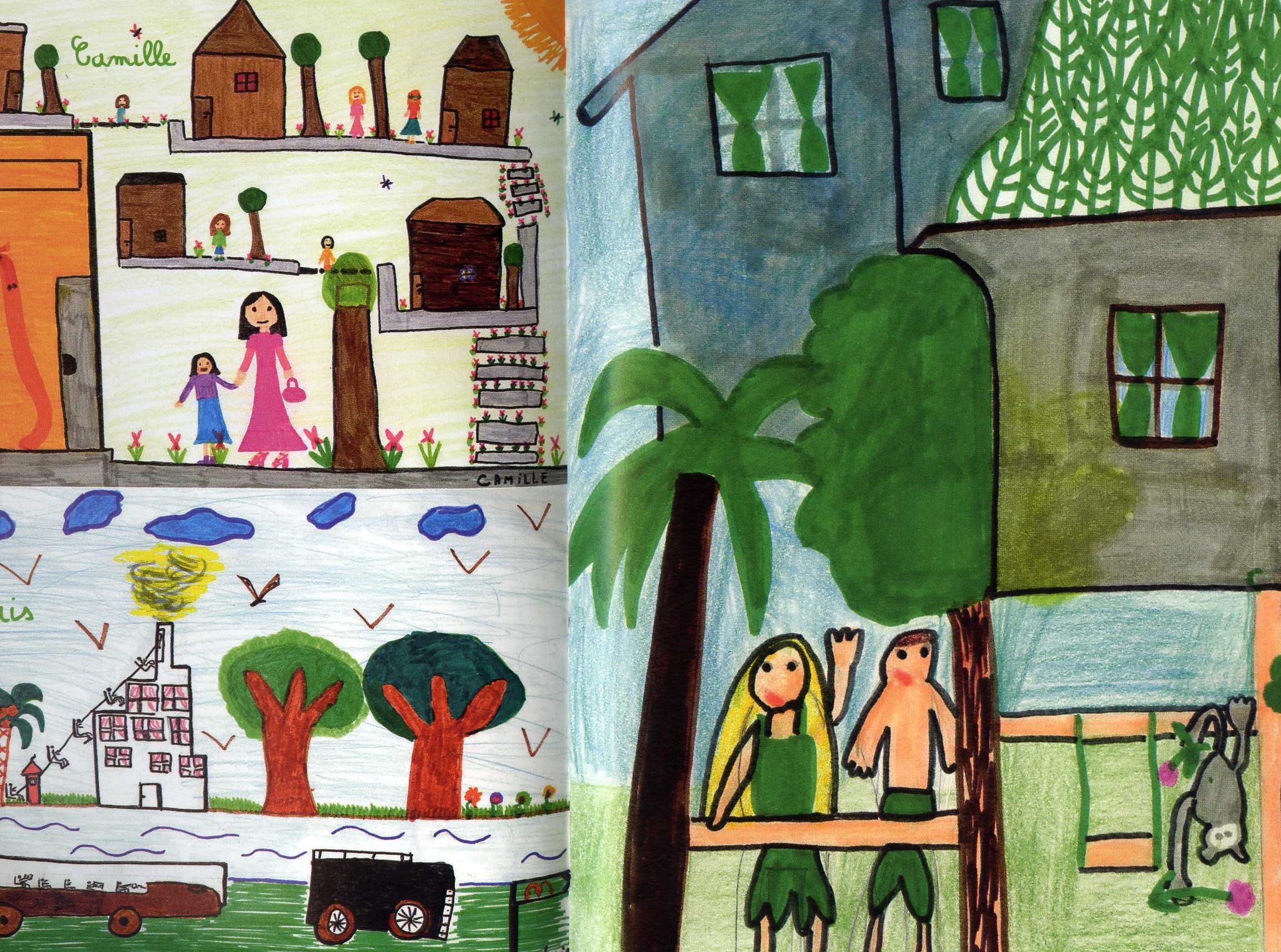 Enfin, « Et soudain, ils se parlèrent… » se termine sur un chapitre fort intéressant, intitulé « Vivement demain ». Les auteurs ont mis à contribution une classe de CE1 (moyenne d’âge 8 ans), et leur ont demandé de dessiner le monde du futur. Tous les dessins des enfants sont reproduits, accompagnés d’un texte très bref que je trouve très curieux. Les auteurs y rappellent que, « Il y a trente ans, lorsqu’on demandait aux enfants de dessiner l’an 2000, navettes spatiales, voitures volantes et alimentation en capsule se disputaient la vedette ». Ils constatent que, 30 ans plus tard, cette vision a radicalement changé, les enfants dessinant dans certains cas