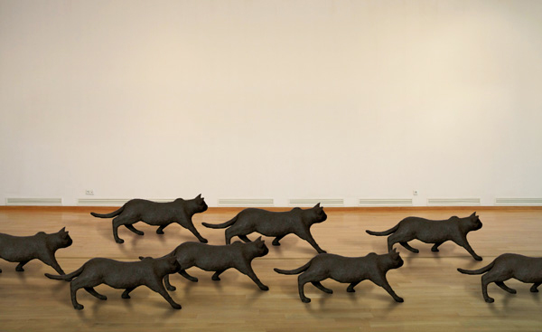 Pourtant, une visite au pas de course confirme qu’il y a aussi du potentiel dans les œuvres. Au premier étage, sculptures, peintures et vidéos d’artistes roumains ayant pour thème l’animalité (probablement une survivance de l’expo temporaire ZOOMANIA.RO qui aurait normalement dû prendre fin le 15 septembre dernier). Il y a de la vitalité dans les couleurs et les peintures, de l’humour (How can you destroy the world by accident, 2010, de Larisa Sitar – la réponse étant : un lâcher de chats noirs !), mais aussi du mystérieux, du sombre et torturé (silhouettes humaines dévorées par des animaux, vidéos mettant en scène des êtres costumés en ours et effectuant une danse tribale et chamanique…).