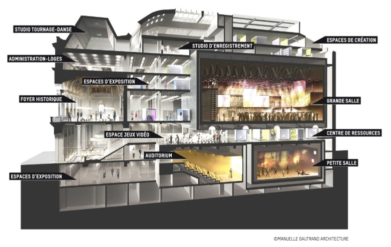 Le montant des travaux (80m€) , les équipements (deux salles de concert, un auditorium, des espaces d’exposition et studios de création, un centre de ressources, une salle de jeux vidéos, des cafés et boutiques…) et le budget de fonctionnement (près de 10m€) sont à la hauteur des ambitions affichées par l’équipe (et devraient, je l’espère, lui permettre de ne pas subir la même galère que le 104 CENTQUATRE, autre lieu phare de la politique culturelle de la Ville de Paris…).